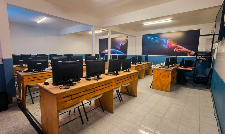 Aula moderna equipada con tecnología actual, donde los alumnos desarrollan competencias digitales y habilidades tecnológicas clave para el aprendizaje contemporáneo.